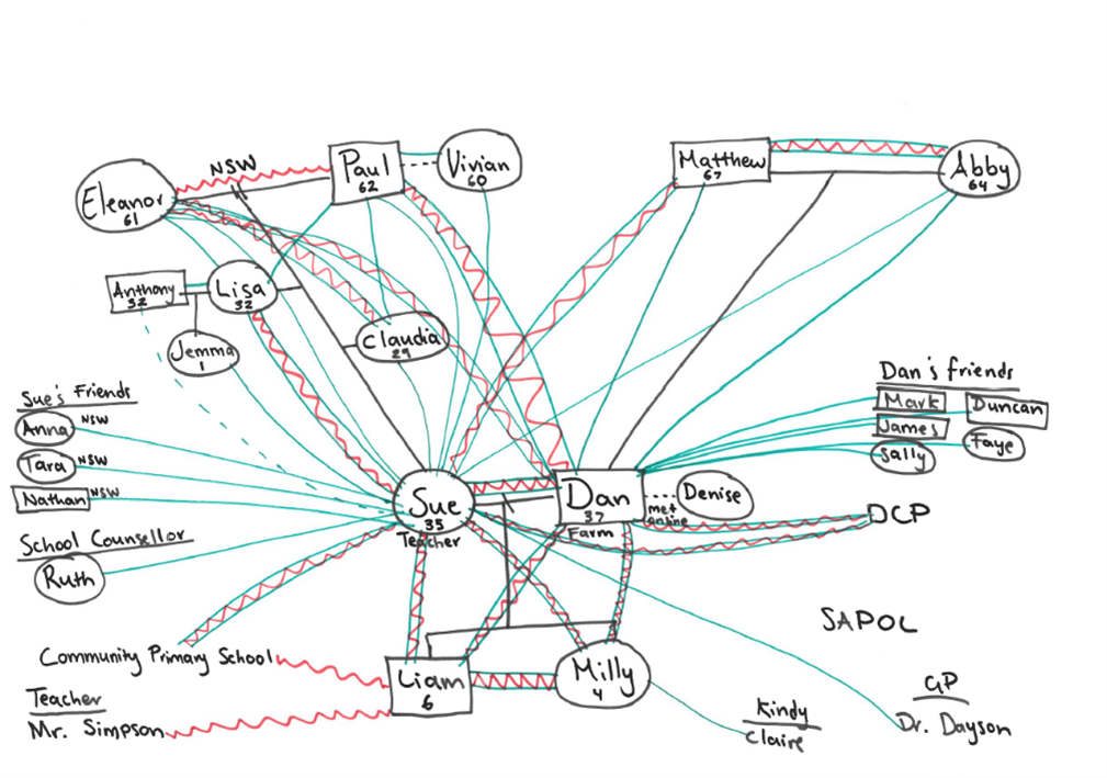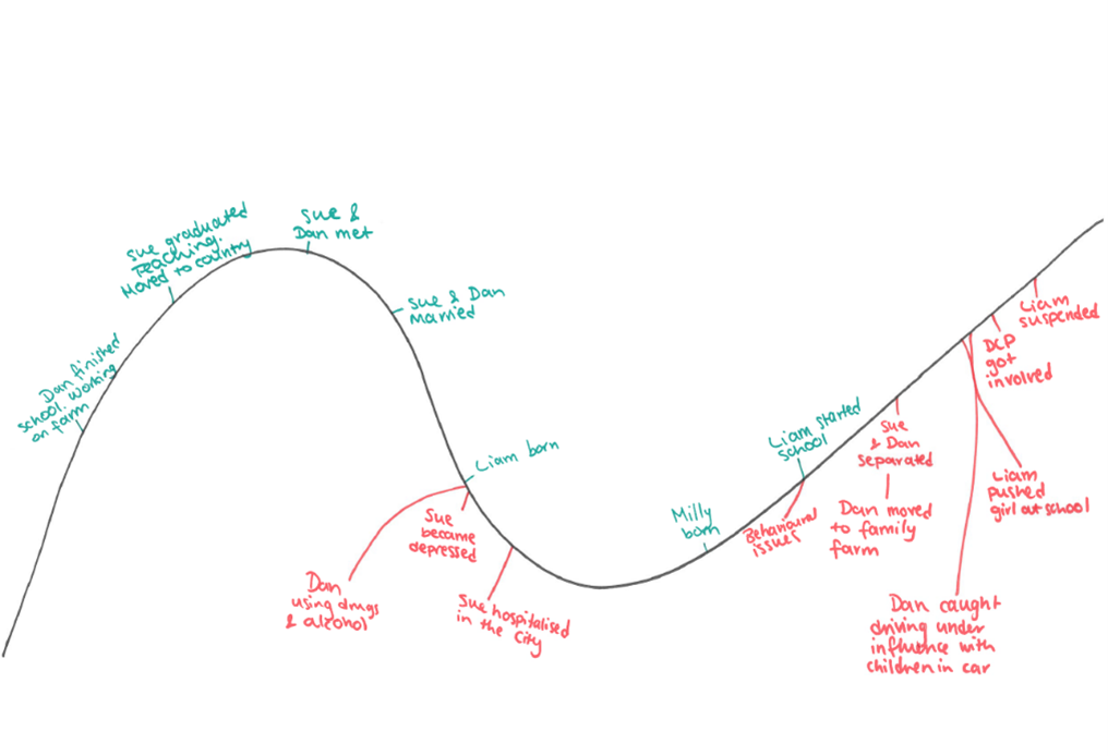 The family lived in a small country town where Dan had grown up on a farm that his parents continued to run. They were very supportive of the family but believed Dan and Sue were not ‘tough enough’ on Liam and attempted to control him through threats and punishment. Sue had come to the area as a teacher from NSW where her parents still lived. She reported that she had a ‘good enough’ relationship with them but they were busy and rarely visited.